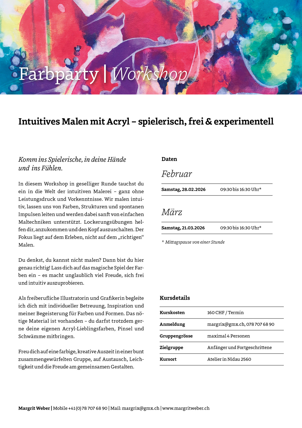 In diesem Workshop in geselliger Runde tauchst du ein in die Welt der intuitiven Malerei – ganz ohne Leistungsdruck und Vorkenntnisse. Wir malen intuitiv, lassen uns von Farben, Strukturen und spontanen Impulsen leiten und werden dabei sanft von einfachen Maltechniken unterstützt. Lockerungsübungen helfen dir, anzukommen und den Kopf auszuschalten. Der Fokus liegt auf dem Erleben, nicht auf dem „richtigen“ Malen.