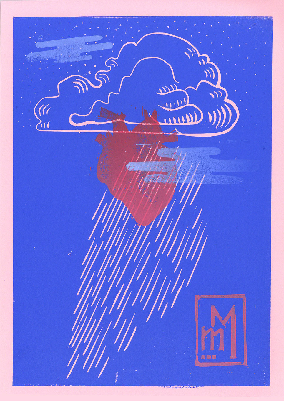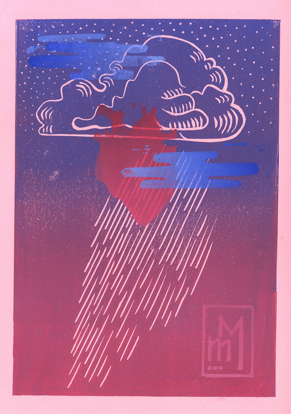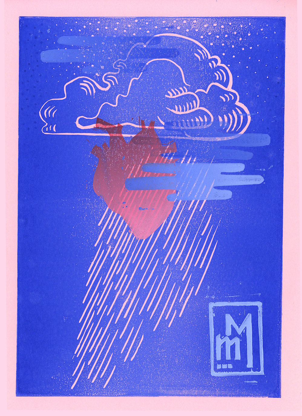Linolschnitt mit farbigen Verläufen, durchscheinende Flächen.
